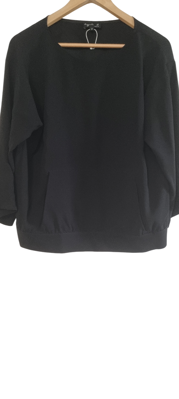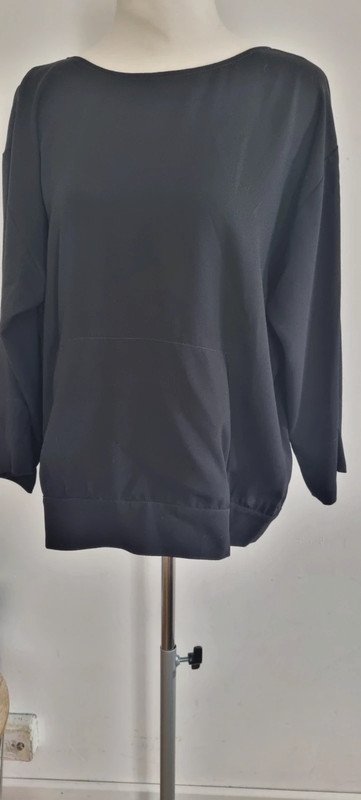 Ce haut en crêpe fluide, col bateau et manches 3/4 avec ourlet large, s’inspire du sweat, avec une poche kangourou sur le devant. Taille 3, équivaut à un 38/40, en excellent état.