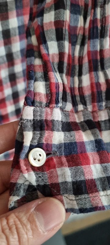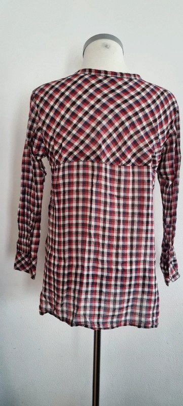 Blouse à carreaux, col rond, manches 3/4, et avec 2 poches plaquées devant, taille 0, en très bon état.