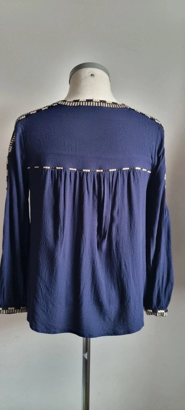 Blouse marine, modèle Christie, avec broderies noires/ beiges, taille 0, en très bon état. Longueur 57 cm Aisselles 46 cm Epaules 35 cm