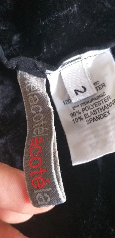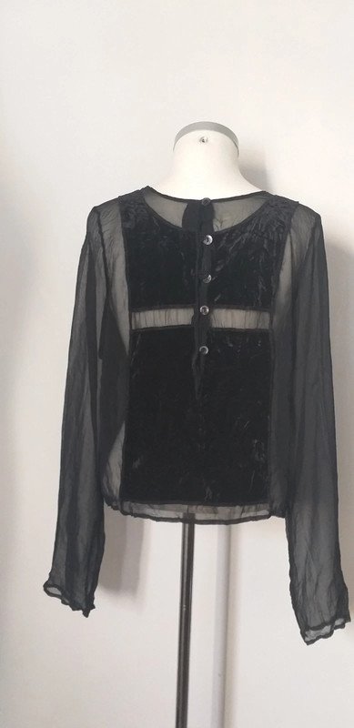 Blouse noire Acoté, transparent par endroit, en velours, avec un bouton de rechange, taille 2, excellent état.