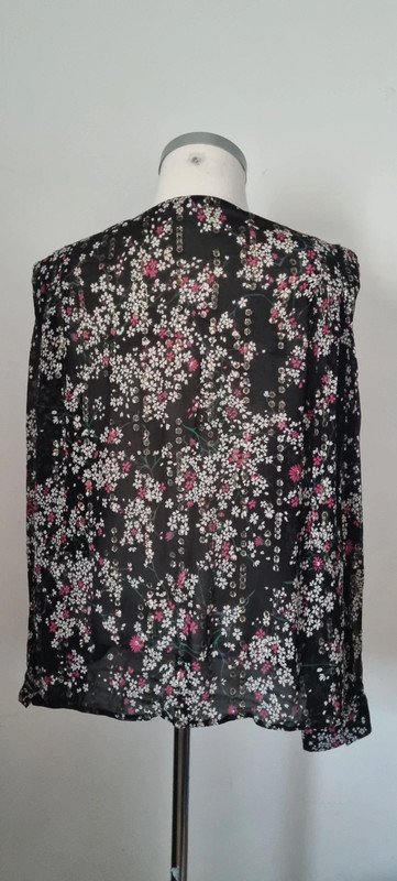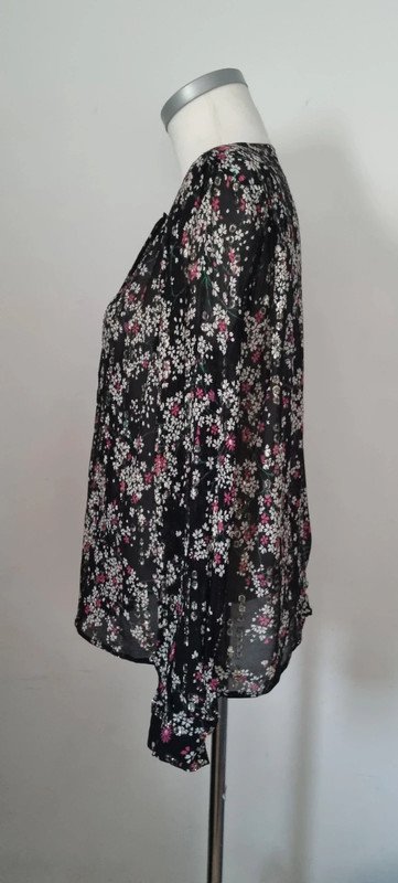 Blouse noire, motif fleur, fil métallisé, taille 38, en très bonne état. Composition : 95 % polyester, 5 % fibres métallisées. Prix boutique, :185 €