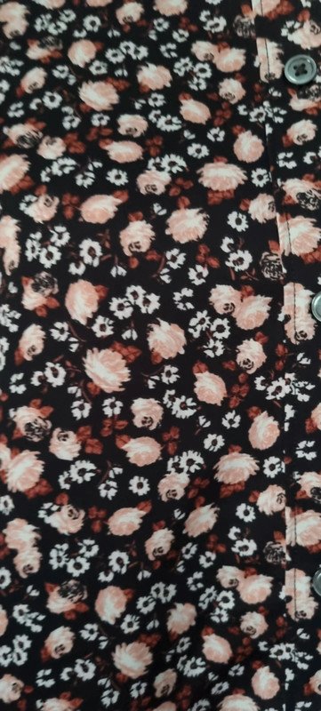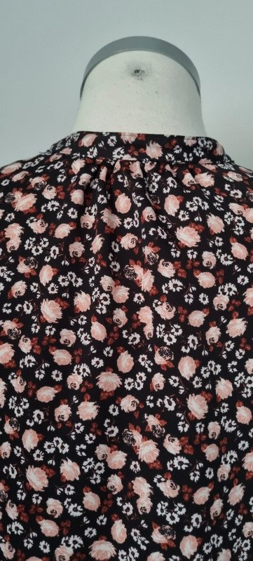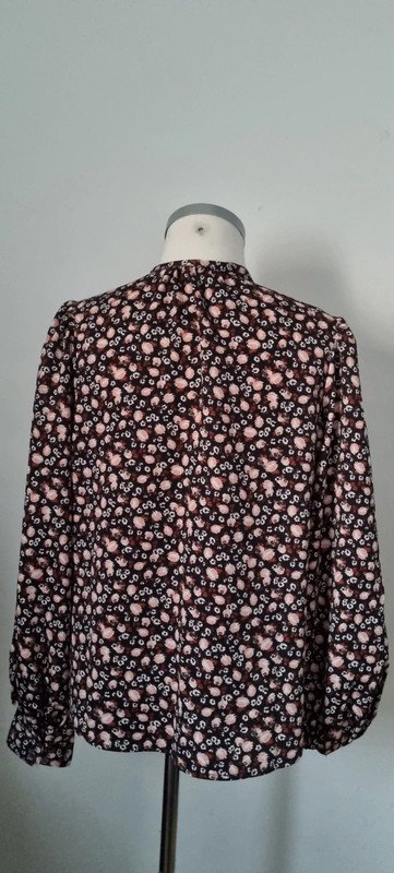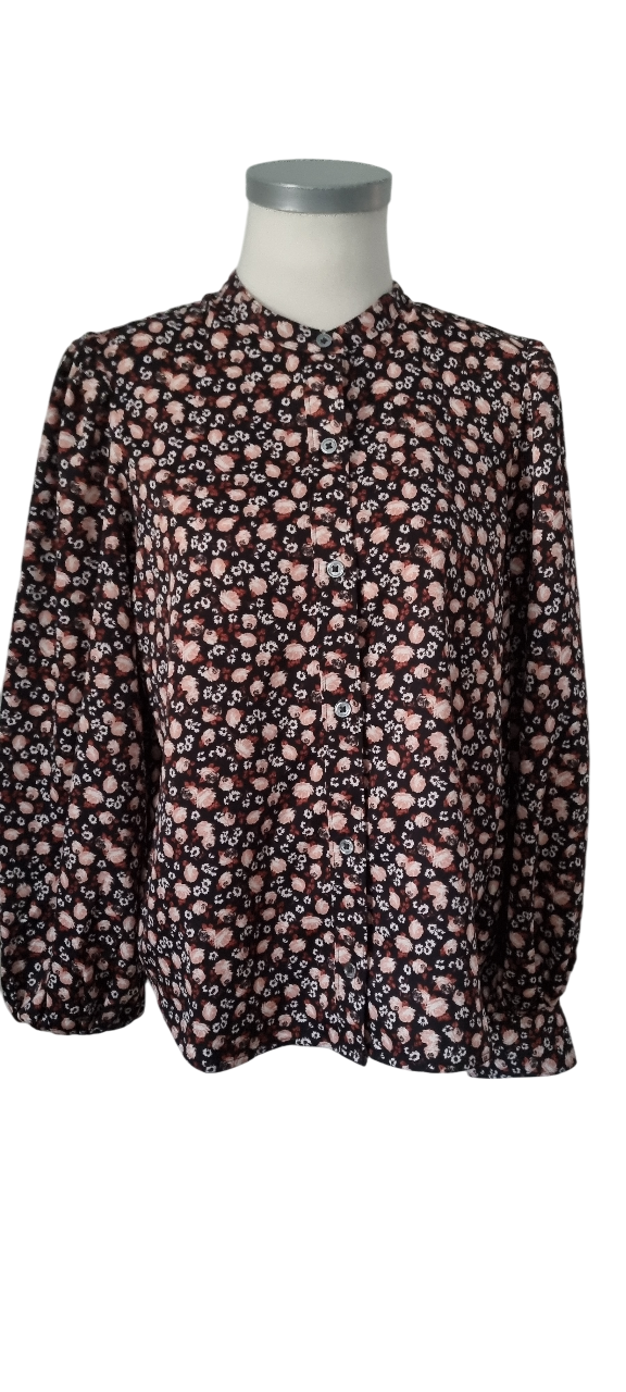 Blouse noire à imprimé fleur, manches bouffantes, boutonnée devant, taille M, en excellent.