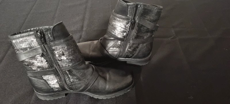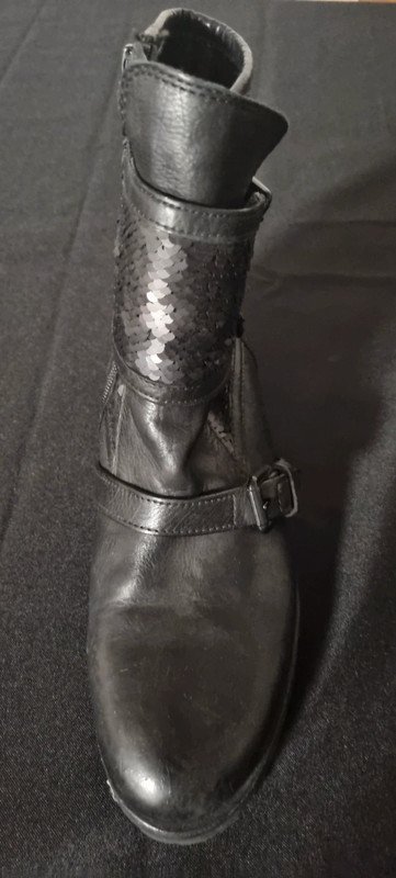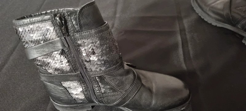 Boots noire en cuir, à strass, taille 4 équivalent taille 37 française, en excellent état.