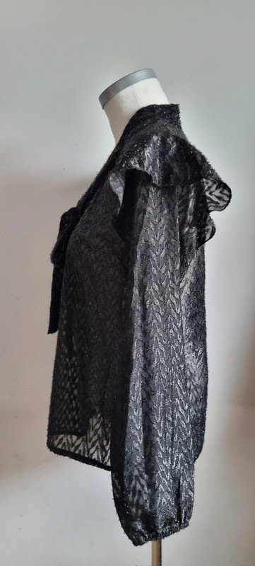 Chemise noire col lavallière, volants sur les épaules, transparente, taille S, en très bon état.
