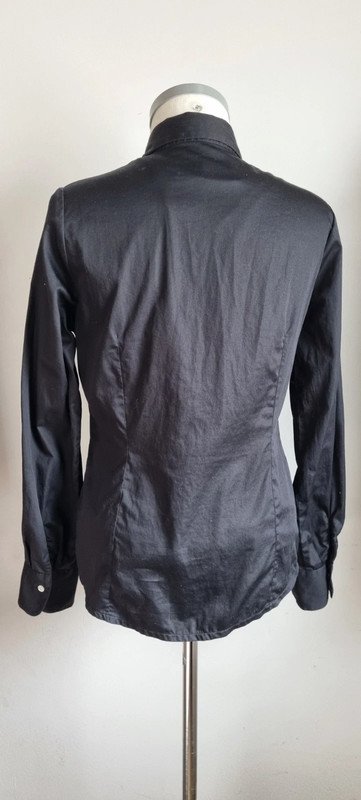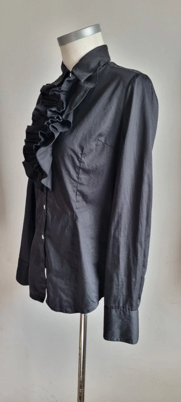 Chemise noire à col jabot, cintrée, taille 38, en excellent état. Longueur 63 cm, épaules 37 cm, aisselle 46 cm