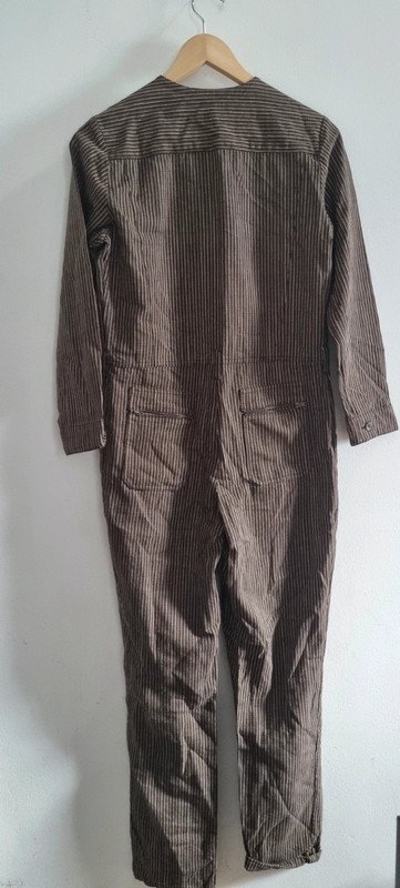 Combinaison en coton épais à fines rayures brunes, col en V, fermeture zippée en métal avec bouton-pression, manches longues, 2 poches italienne et 2 poches plaquées avec détail zippé à l’avant et à l’arrière, passants de ceinture, modèle fanfare, taille 36, excellent état. Composition : 100 % coton Longueur : 140 cm Hanches : 48 cm Taille : 42 cm