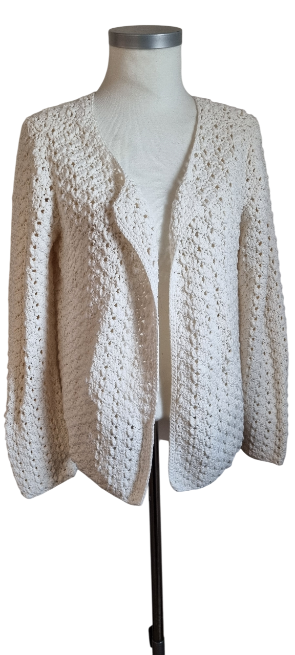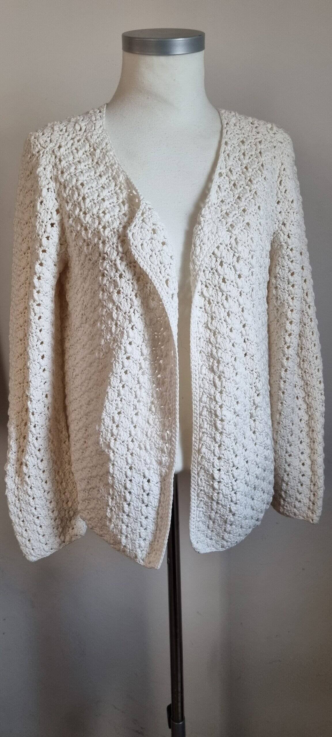 Gilet écru, en crochet, sans bouton, taille 3, en excellent état. Longueur : 58 vm Epaule : 45 cm