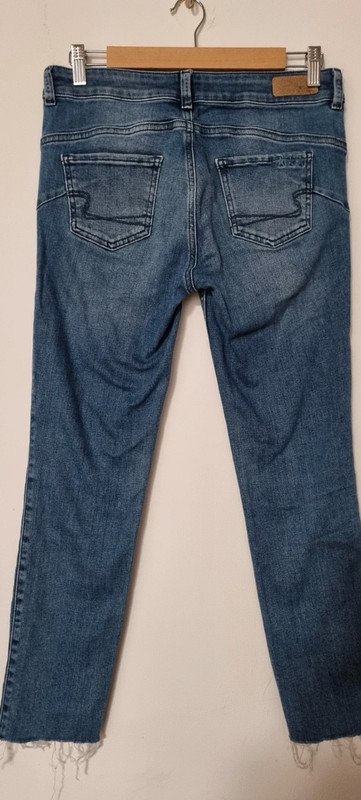 Jean bleu effiloché, il manque l’étiquette d’entretien. Taille 38, en très bon état.