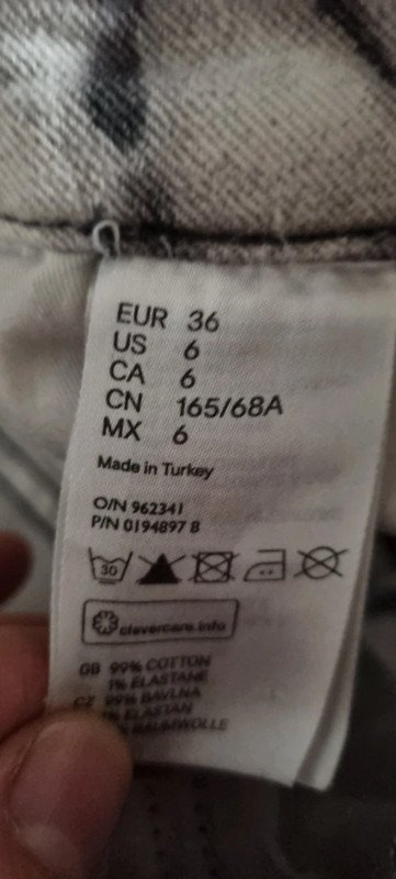 Jean imprimé, zip à la cheville, taille 36, en très bon état.