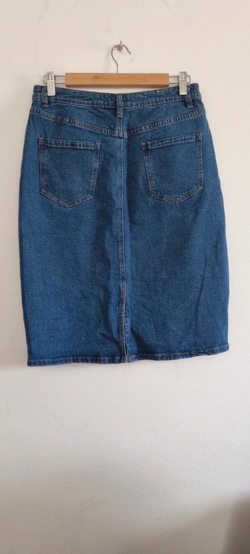 Jupe bleue, fermeture zippée et bouton, avec petite fente derrière, taille 40, en excellent état. Dimension : Taille 36 cm Longueur 58 cm,