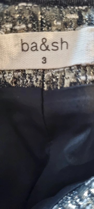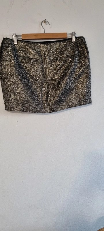 Jupe courte noire et dorée, avec 2 poches devant et 2 poches a l’arrière, fermeture zippée. Taille 3, en très bon état.