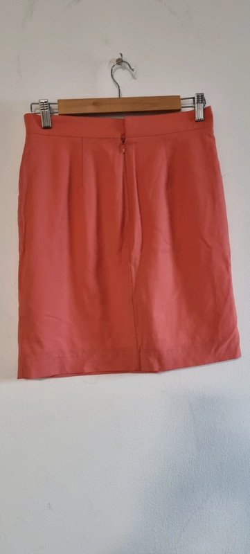 Jupe courte, corail, 2 poches avec liseré doré, fermeture zippée et crochet.