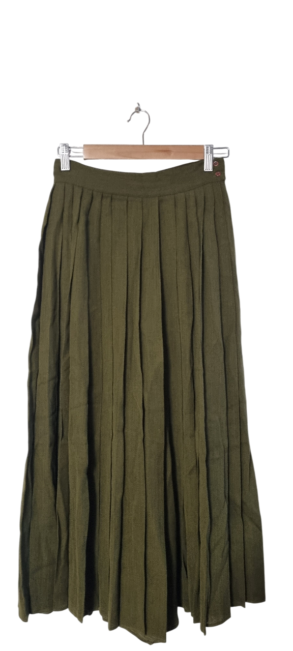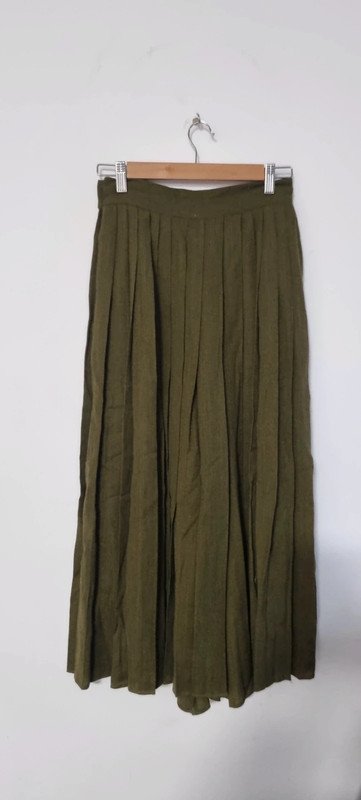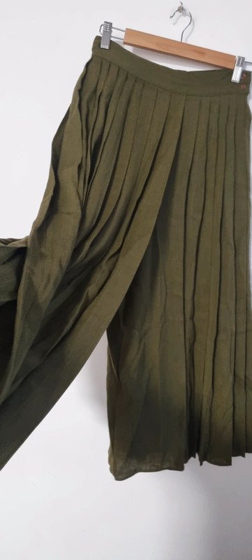 Jupe culotte, longue et plissée, kaki, fermeture boutons et zippée, taille 38 , en tres bon état. Taille 34 cm Longueur 84 cm