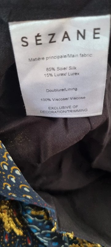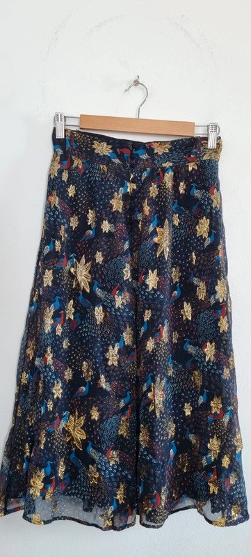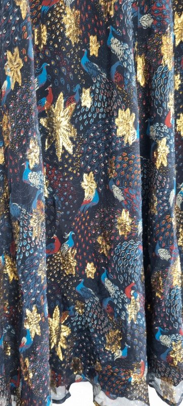 Jupe marine imprimée paon et motifs fleur lurex, passants pour ceinture, taille 36, en excellent état. Composition : 85 % soie, 15 % lurex Doublure : 100 % viscose. Longueur : 78 cm Taille : 34 cm