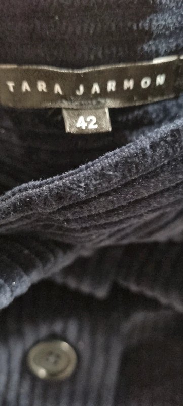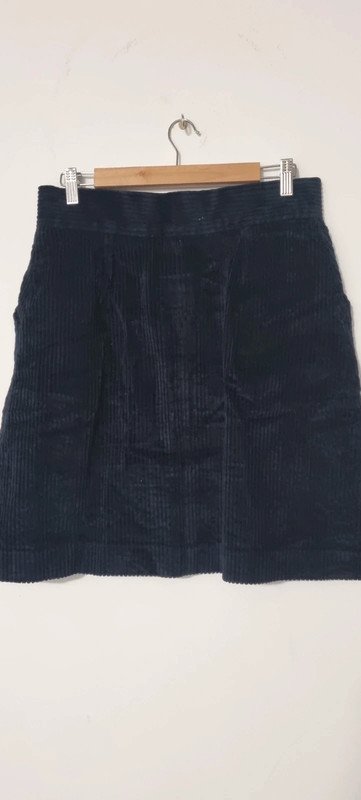 Jupe marine, en velours côtelé, avec poches, boutonnée devant, taille 42, en excellent état. Passée au pressing.