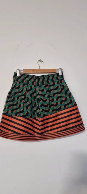 Jupe courte, coupe trapèze, multicolore, taille 38, en excellent état. Taille 32 cm Longueur 42 cm