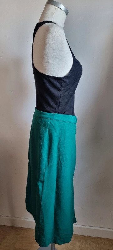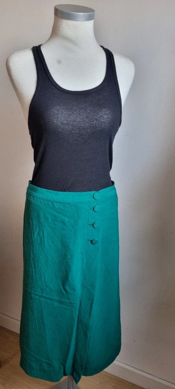 Jupe droite, verte, modèle Maisie, fermeture par boutons en tissu, entièrement doublée, taille 38, en très bon état. Composition : 49 % viscose, 46 % lin, 5 % élasthanne