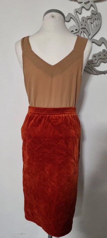 Jupe rouge en velours matelassée, poches latérales, taille S, en très bon état. Composition : 80 % coton 20 % polyester