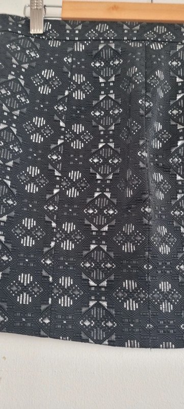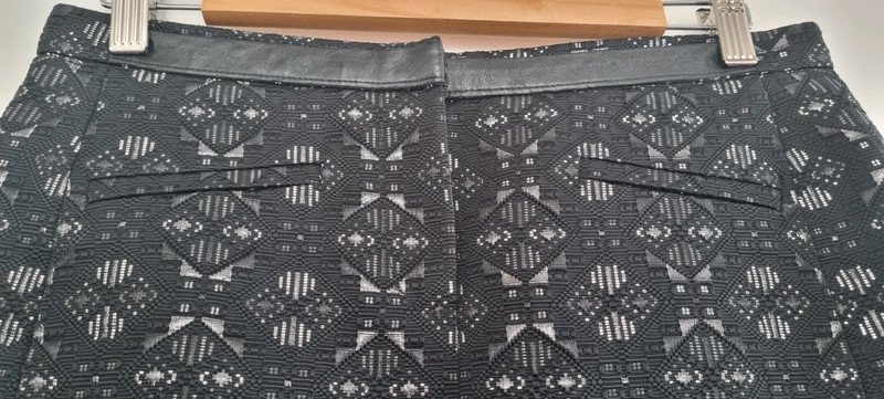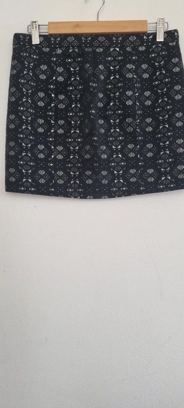 Mini jupe noire, motif argenté, taille 34, excellent état.