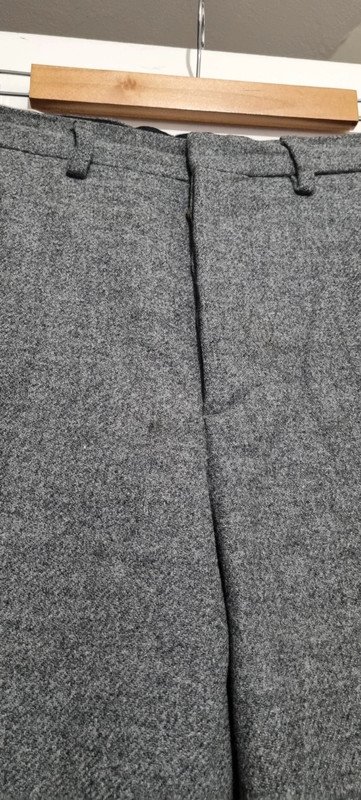 Pantalon gris en laine, fermeture boutonnée, taille 38, en très bon état. Composition : 100 % laine Longueur : 106 cm Taille : 40 cm