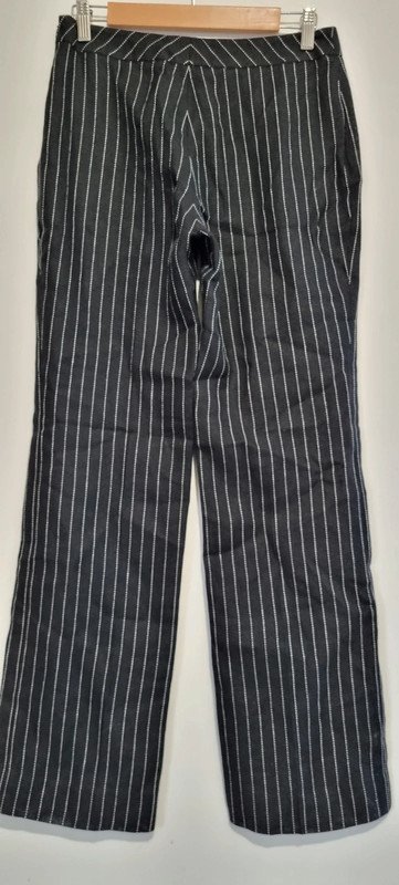 Pantalon large noir avec une fine rayure blanche, coupe droite, taille 38, en très bon état.