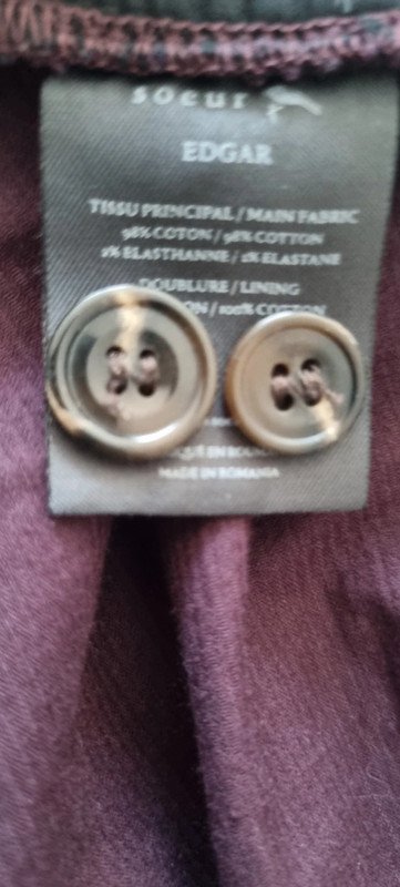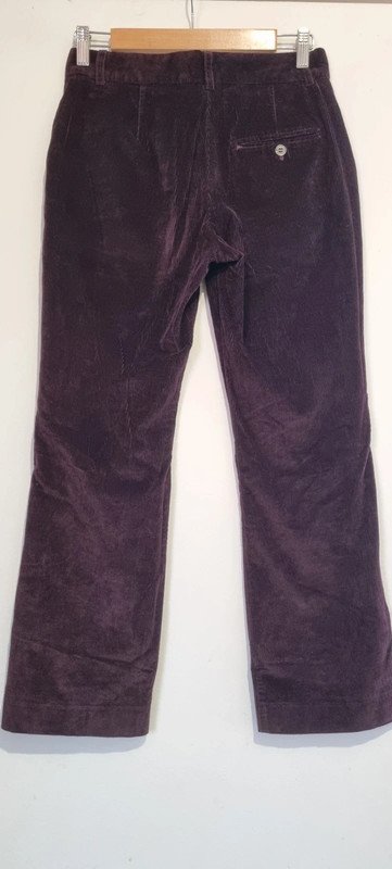 Pantalon couleur aubergine, en velours côtelé en coton stretch, coupe flare, longueur 7/8e, fermeture zippée, un bouton, passants pour ceinture, 2 poches à l’italienne, une poche passepoilée et boutonnée à l’arrière. Taille 36, les photos ne sont pas très reussies, mais le pantalon est en excellent état.