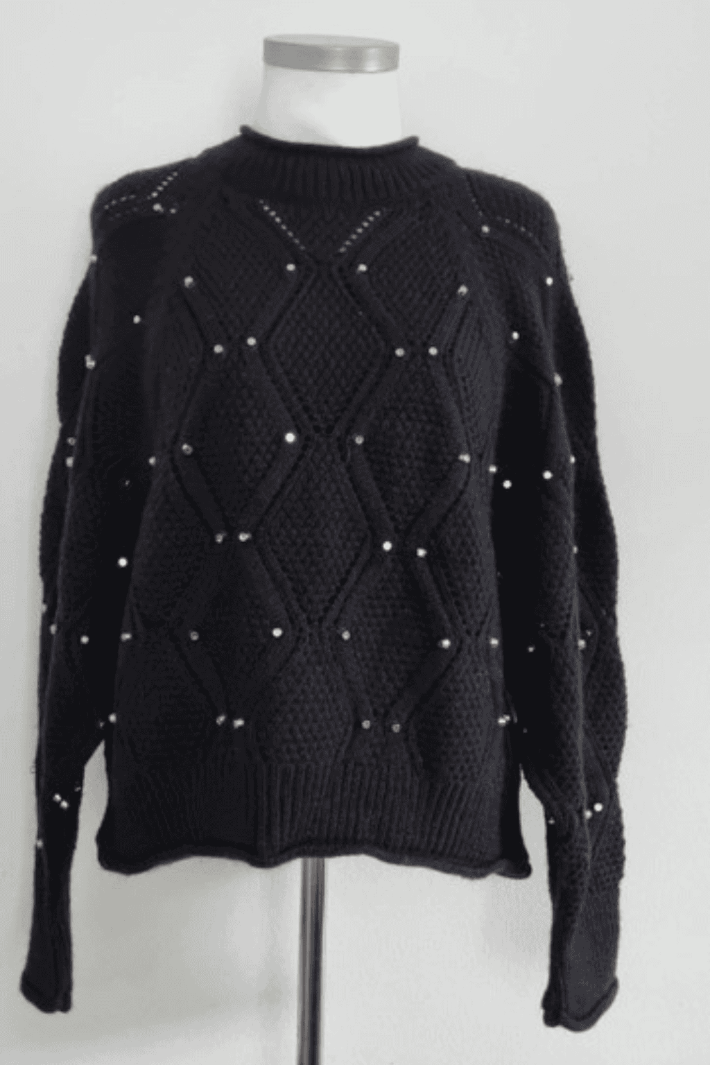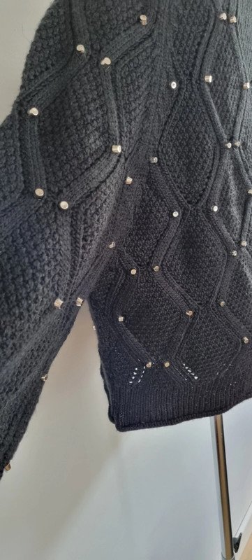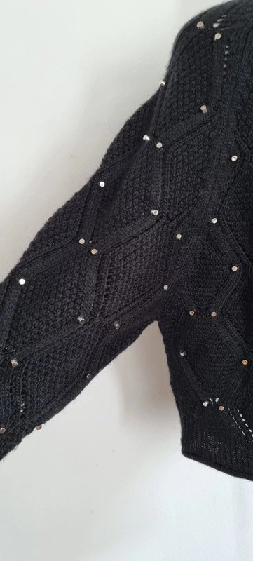 Pull Mango maille clouté en laine mélangé. Grosse maille, Ornement à clous, col rond, couture tombante sur l’épaule, manches longues. Bords côtelés, neuf sans étiquette, jamais porté.