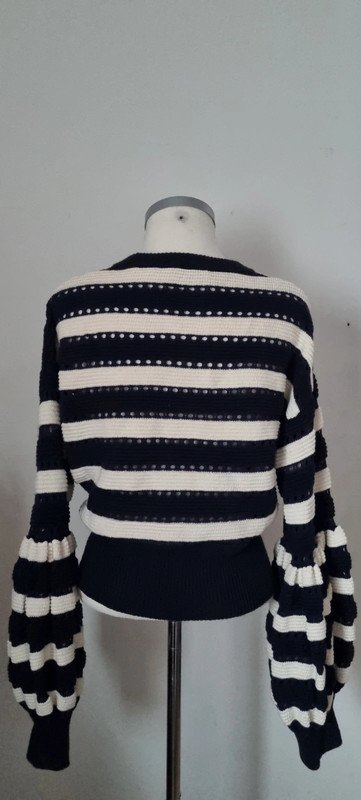 Pull marine rayé, manches longues ballon, ajouré, taille L, en très bon état.