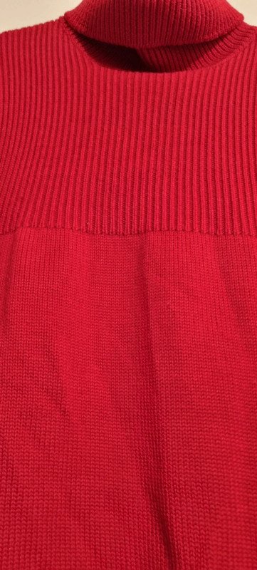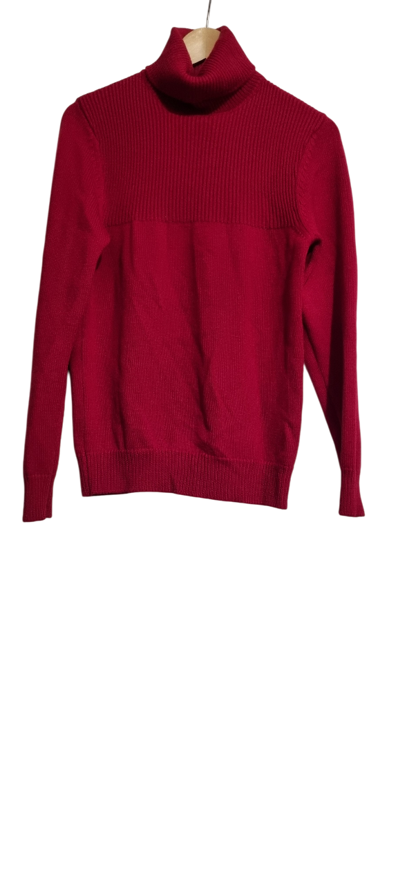 Pull rouge, col roulé, taille assez près du corps, taille 0, en très bon état. Longueur 66 cm Aisselles 47 cm Epaule 36 cm
