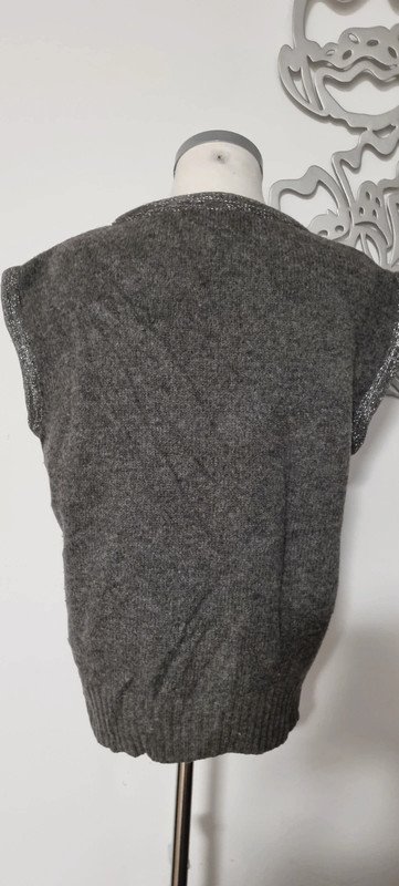 Pull sans manches, gris, tour de cou et contour des manches avec fil lurex, motif devant, très beau porté. Composition : 100 % laine.