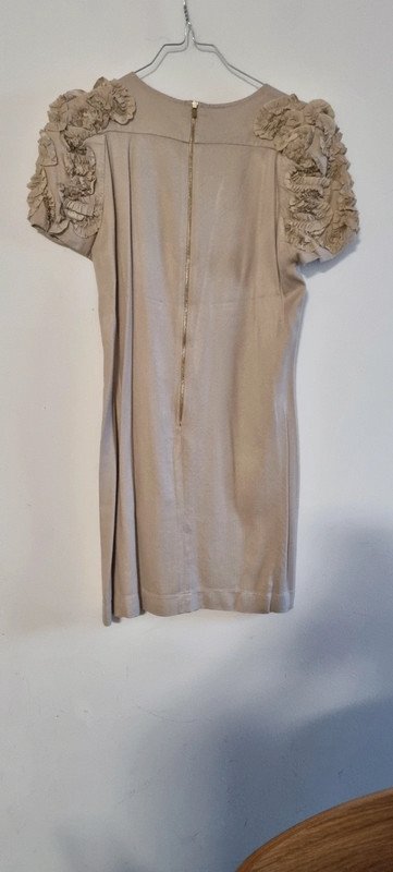 Robe Beige avec froufrou sur les épaules et zippée dans le dos, avec une petite tache à peine visible sur la 2ème photo, taille 1, en très bon état.