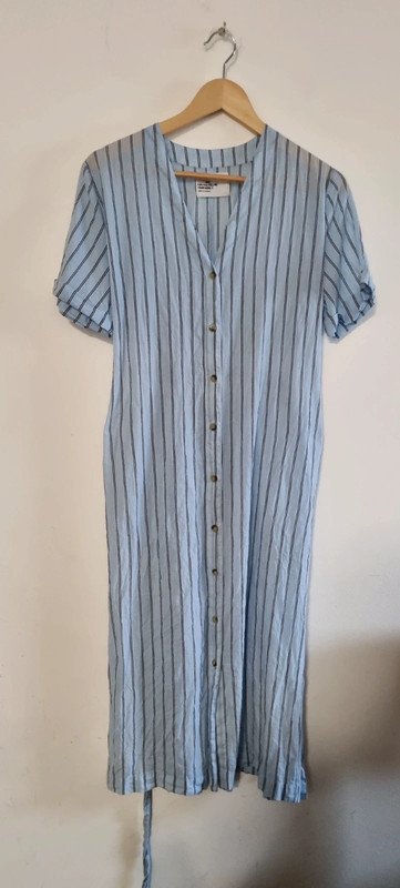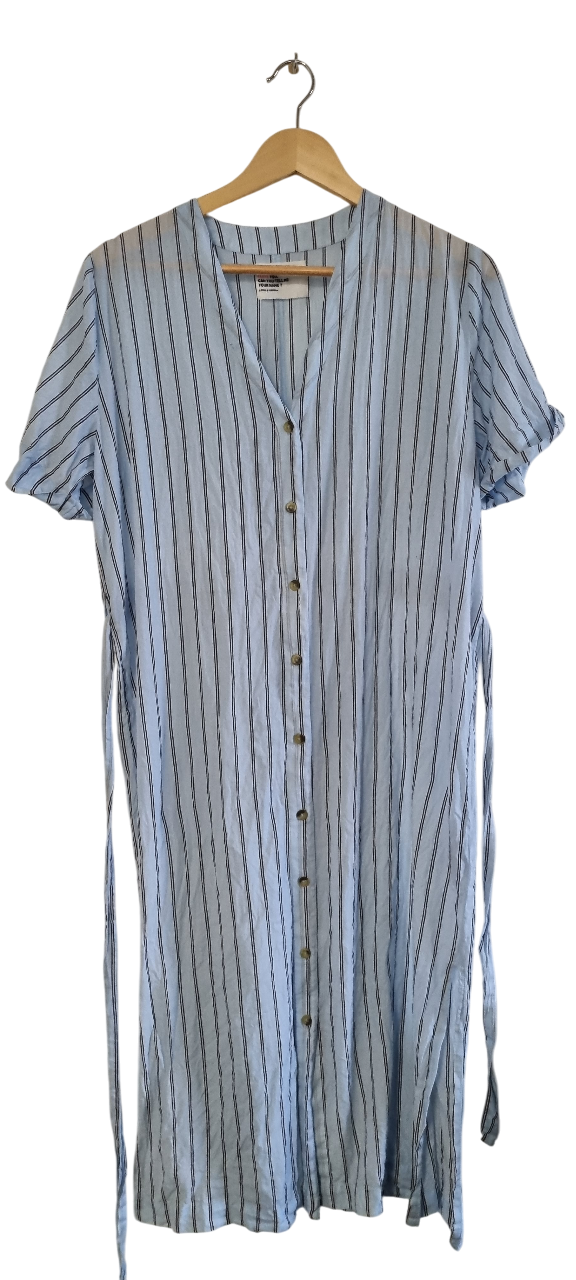 Robe mi-longue rayé à manches courtes, boutonnée devant, col V, elle est resserrée à la taille par une ceinture intégré à nouer.