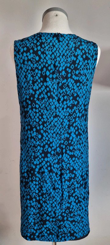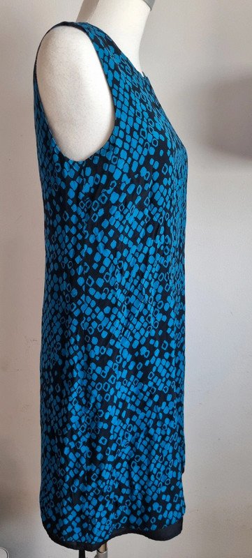 Robe droite sans manches en soie Missoni. Robe sans manches bleue turquoise et noire. Doublure noire unie. Fermeture éclair au dos. Taille 42 italienne équivalent 38 taille française. Longueur : 91 cm