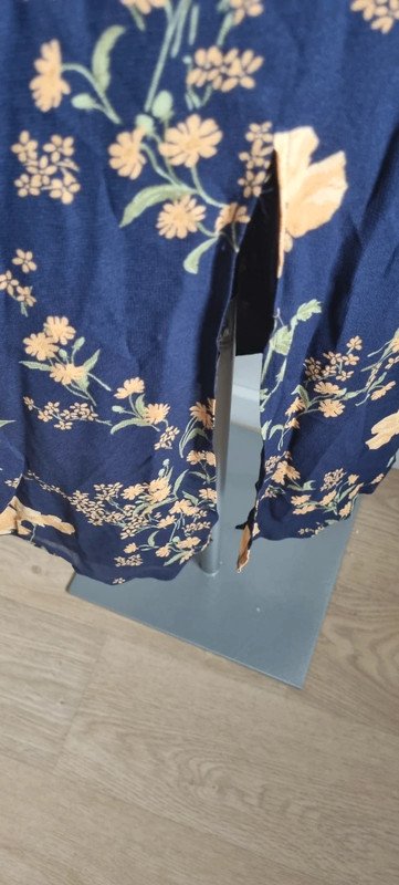 Robe bleue imprimée à fleur, zippée dans le dos, taille 0, en excellent état. Longueur : 114 cm Epaules : 37 cm