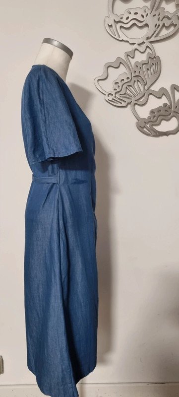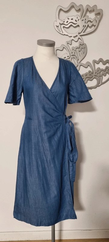 Robe cache coeur en jean souple, mi longue, manches courtes, avec poches, couleur bleu jean taille 36, en très bon état.