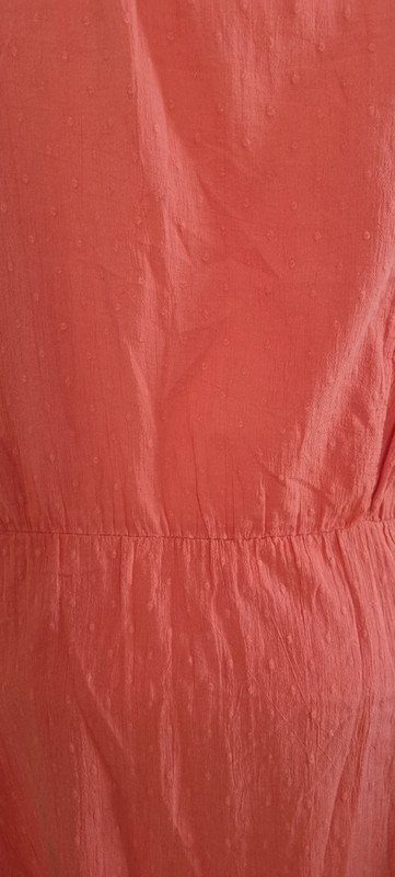 Robe corail, doublée tissu plumetis, sans manches, resserrée à la taille par un élastique, il manque l’étiquette d’entretien et de composition. Taille 36, en très bon état.