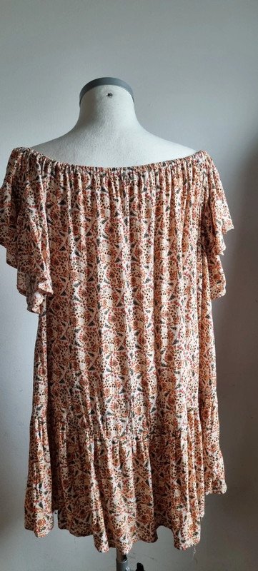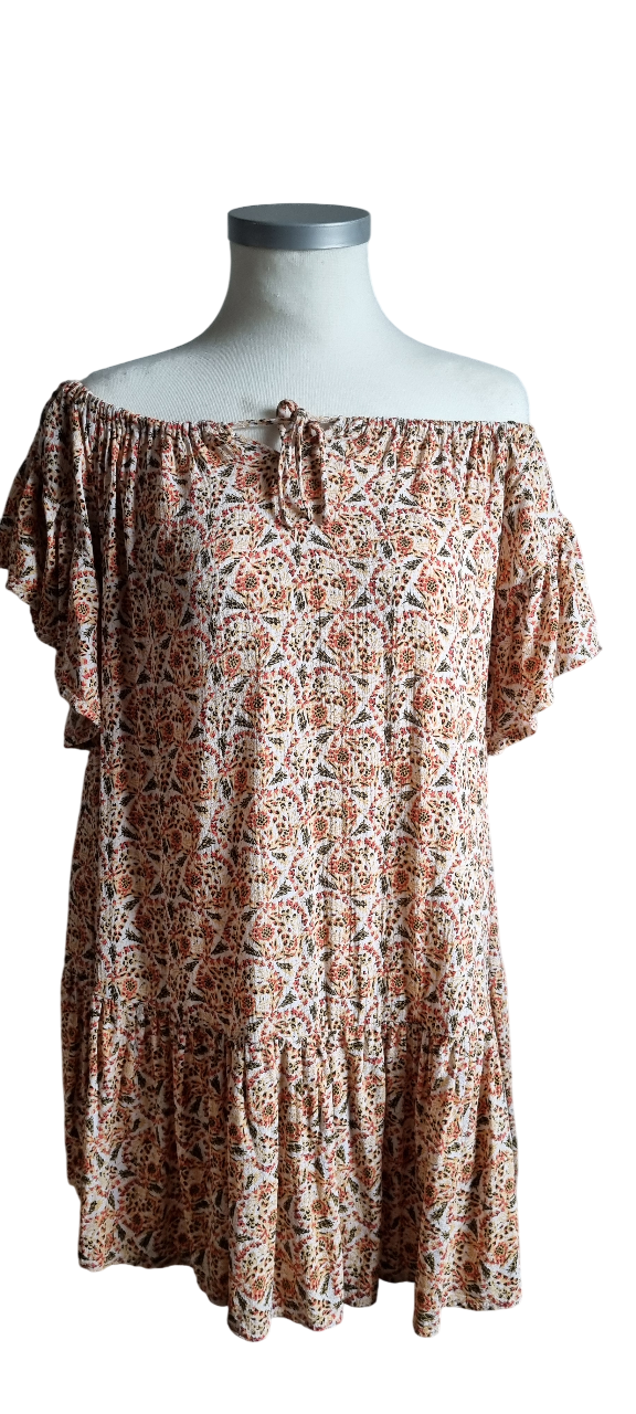 Robe crème fleurie, manches courtes, taille S, en très bon état.