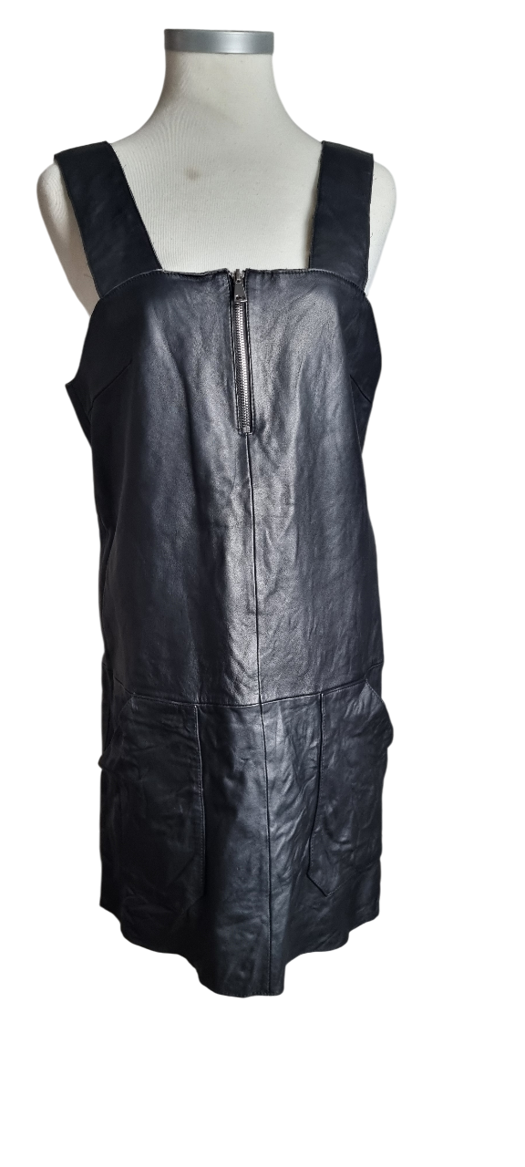 Robe en cuir noire, modèle ludivine, large bretelles, zippée à l’avant pour la fantaisie et en tant que fermeture à l’arrière et 2 poches plaquées à l’avant, taille 2, en très bon état.