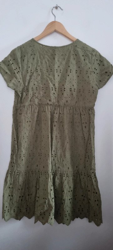 Robe courte kaki, manche courte, en dentelle anglaise, taille M, en très bon état. Épaules : 37 cm Longueur : 88 cm