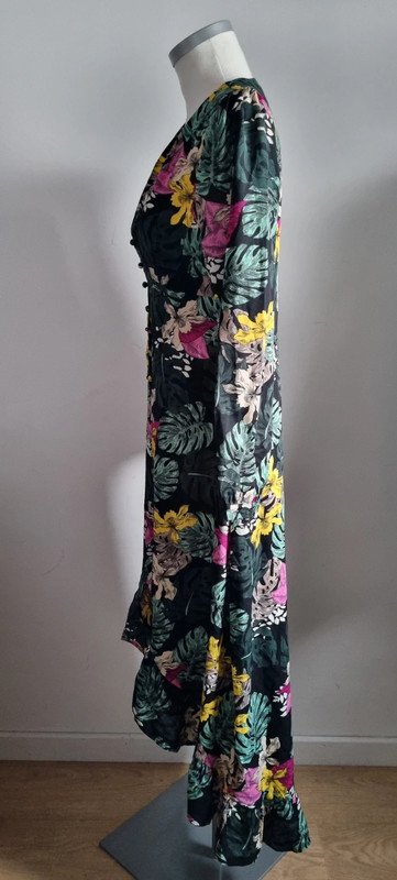 Robe longue, asymétrique longue derrière et plus courte a l’avant, boutonnée devant, manches longues, taille S, en très bon état. Longueur à l’arrière : 140 cm