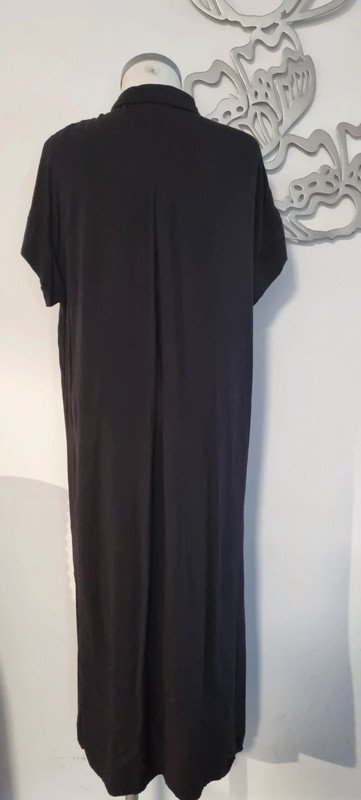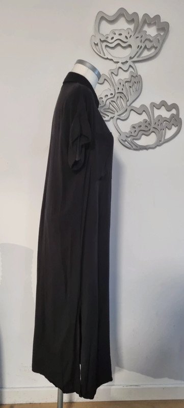 Robe longue noire, boutonnée, et manches courtes, col chemise, taille S, en très bon état.