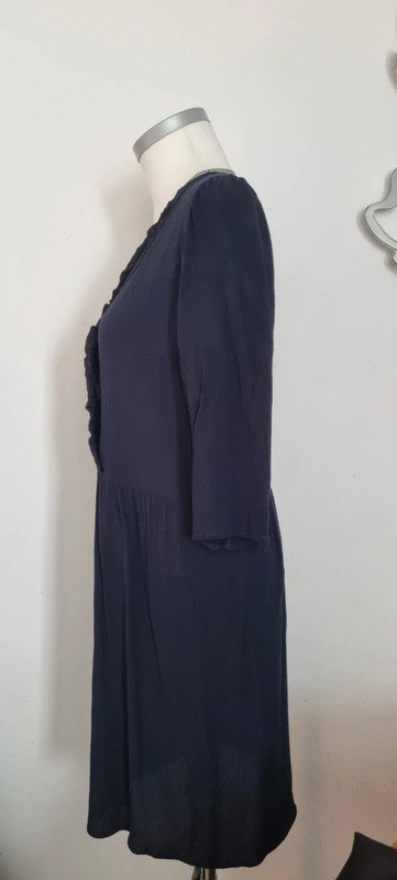 Robe marine, modèle Emizo, coupe cache-coeur, col V, manches longues, volants, en crêpe, fermeture boutons-pression devant. Composition : 100% Viscose