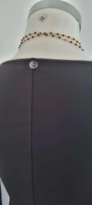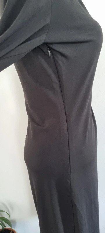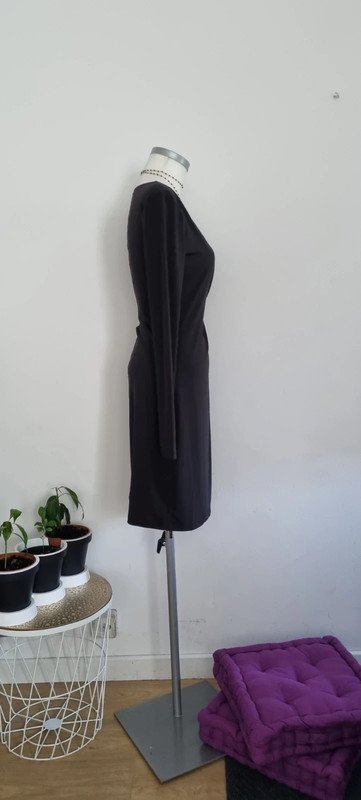 Robe noire col V, manche longue, des fronces au niveau du côté gauche, fluide, se porte près du corps, il manque les épaulettes, mais elle est bien porté même sans celles-ci, taille S, en très bon état.