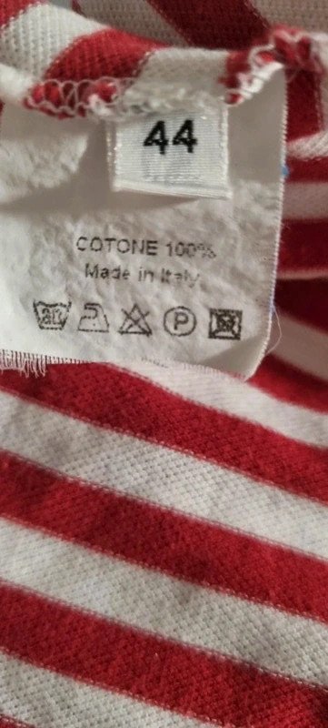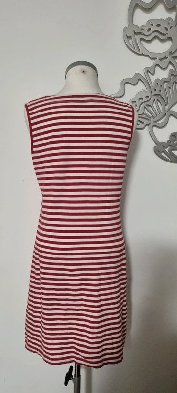 Robe rayée rouge, manches courtes, 2 poches sur les côtés, taille 44 italienne, equivalent taille 40, Composition : 100% coton.