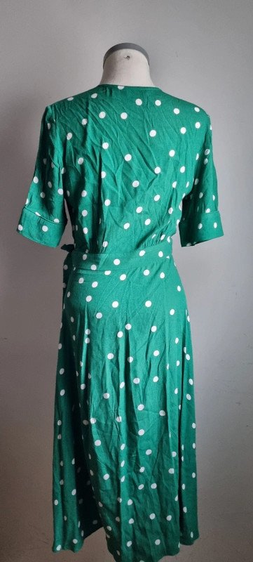 Robe portefeuille, imprimée pois, mi-longue, taille 36, en très bon état.