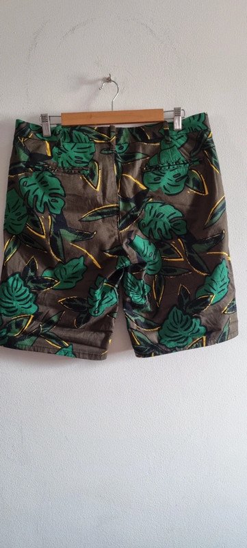 Short kaki avec imprimé feuillages, 2 poches plaquées, 2 poches latérales, taille 42, en excellent état.