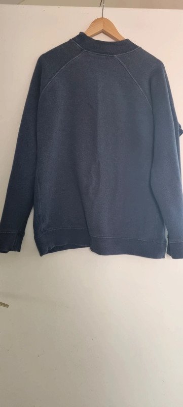 Sweat-shirt marine, en coton molletonné épais, poches kangourou, col rond, taille L, en très bon état.