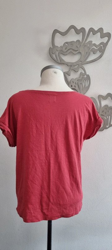 Tee-shirt col rond et dégagé, manches courtes avec petits revers, coupe droite Couleur framboise, taille 1, en très bon état Modèle : Zeliza Composition:100% Coton