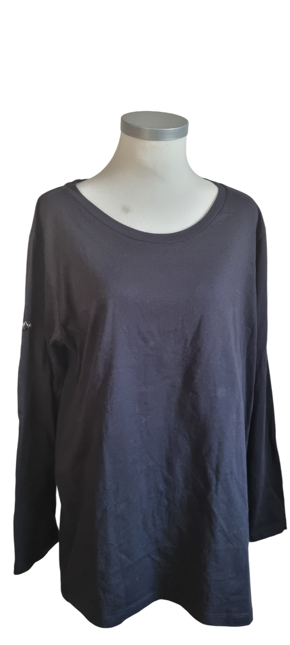Tee-shirt noir, taille L, en très bon état. Sur les photos, il a l’air plus clair, il est bien foncé.