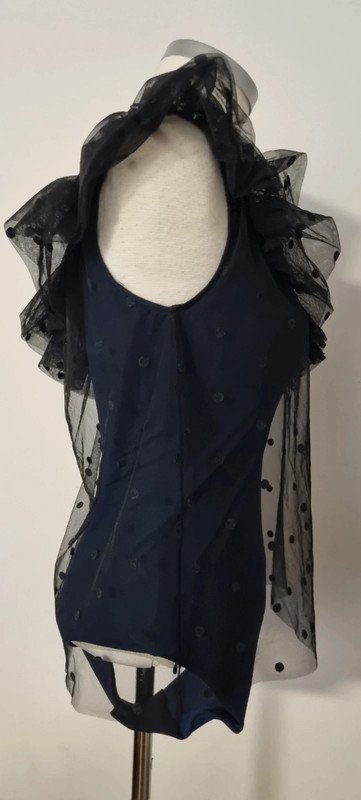 Top Asymétrique Plumetis à volant, bi matière, tulle noire, une épaule dénudée, taille 1, en excellent état.
